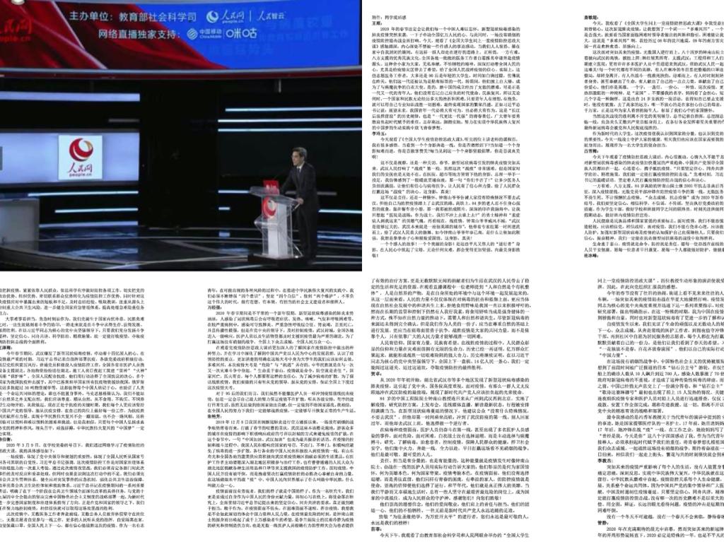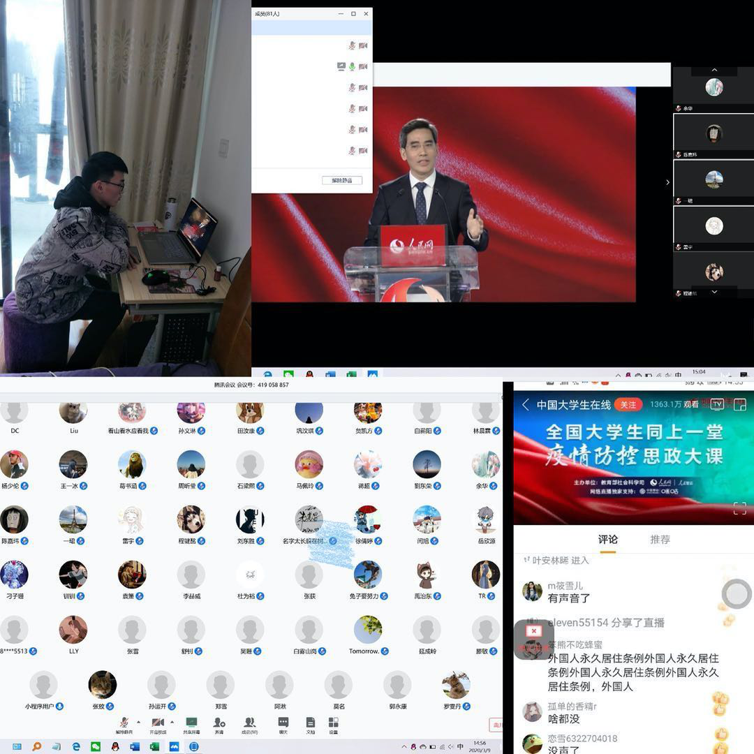 3月9日,教育部社会科学司、人民网联合举办“全国大学生同上一堂疫情防控思政大课”,由清华大学马克思主义学院艾四林教授、中国人民大学马克思主义学院秦宣教授、北京师范大学马克思主义学院王炳林教授、中央财经大学马克思主义学院冯秀军教授主讲。他们结合“马克思主义基本原理概论”“毛泽东思想和中国特色社会主义理论体系概论”“中国近现代史纲要”“思想道德修养与法律基础”四门必修课教学内容,解读以习近平同志为核心的党中央关于疫情防控的决策部署,分析中国抗疫彰显的中国共产党领导和中国特色社会主义制度的显著优势,讲述疫情防控一线的感人故事。环境学院组织全体学生通过网络媒体平台收看了直播。