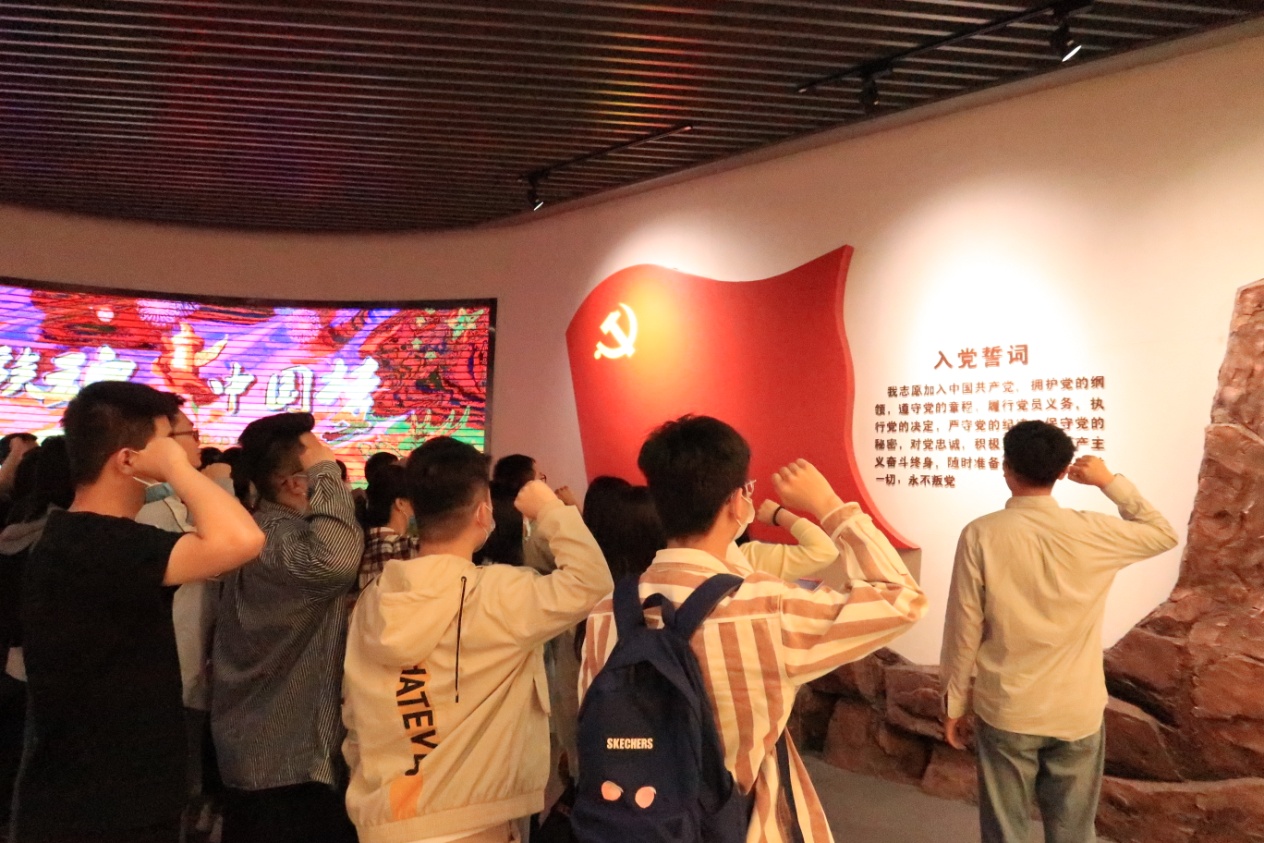 大沽河博物馆系统展现了大沽河流域的历史文明、水利治理和民俗风情。包括党史馆、自然资源展馆、河流历史及传说展馆等七大展馆。老师和同学们在讲解员的带领下参观了党史馆,一张张珍贵的历史照片,一件件斑驳的实物再现了胶州党组织90多年来在党中央领导下,争取民族独立,建设美丽家园的光辉历程。大家一边聆听讲解,一边思考讨论,了解一大代表邓恩铭,抗日斗士姜谔生,地方花木兰冷思成等革命先烈的英雄事迹,深受触动和鼓舞。在参观完党史馆后,党员同志们齐聚在党旗前,举起右拳,重温入党誓词。铮铮誓言,告慰先烈;永葆初心,接续奋发。接着,老师和同学们参观了其他展馆,领略了大沽河沿岸人民治理水患的奋斗精神和开辟海上丝绸之路的拓荒精神。