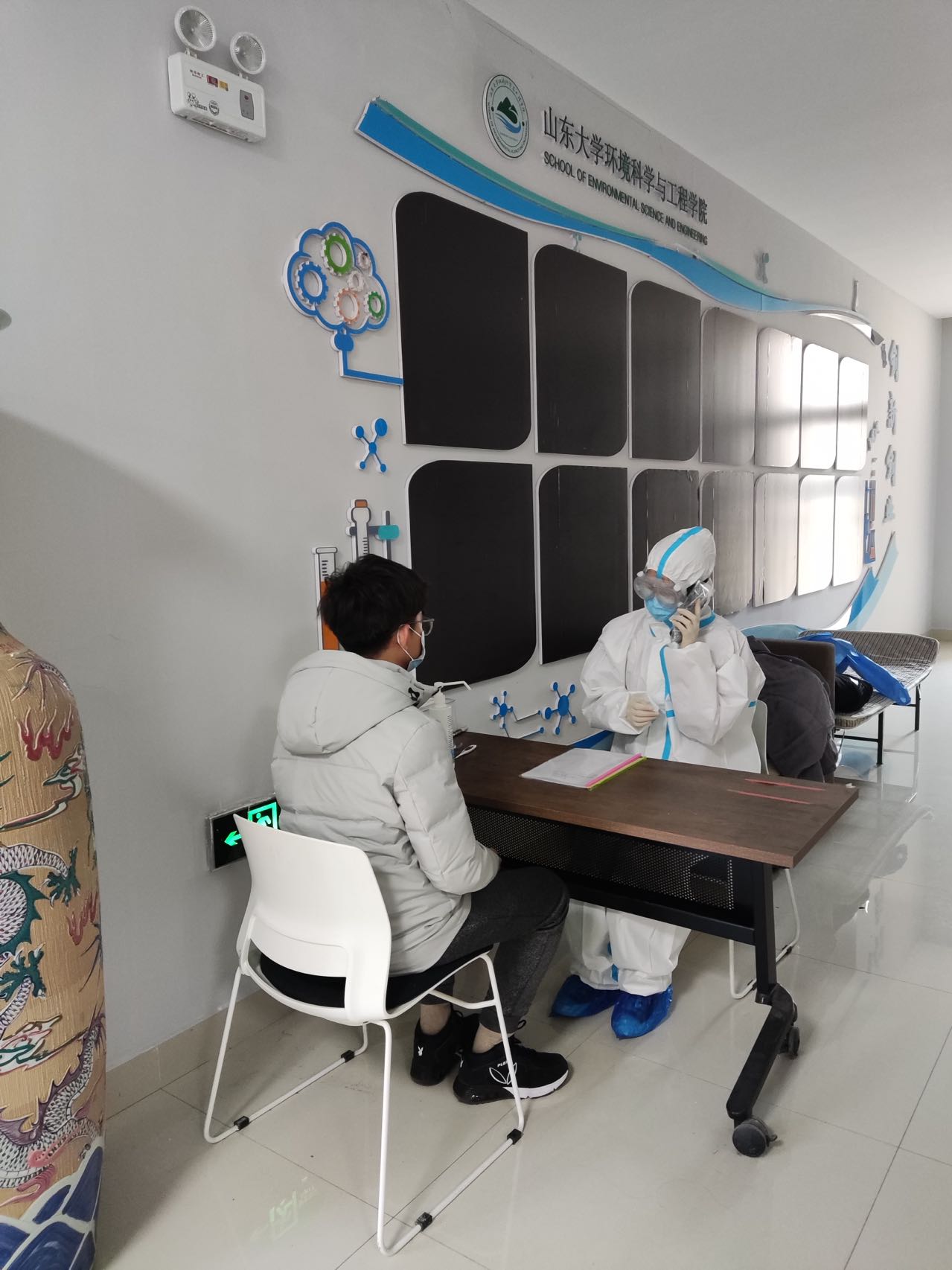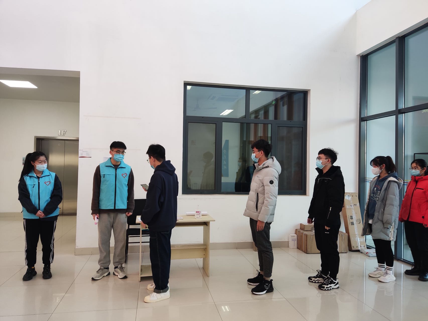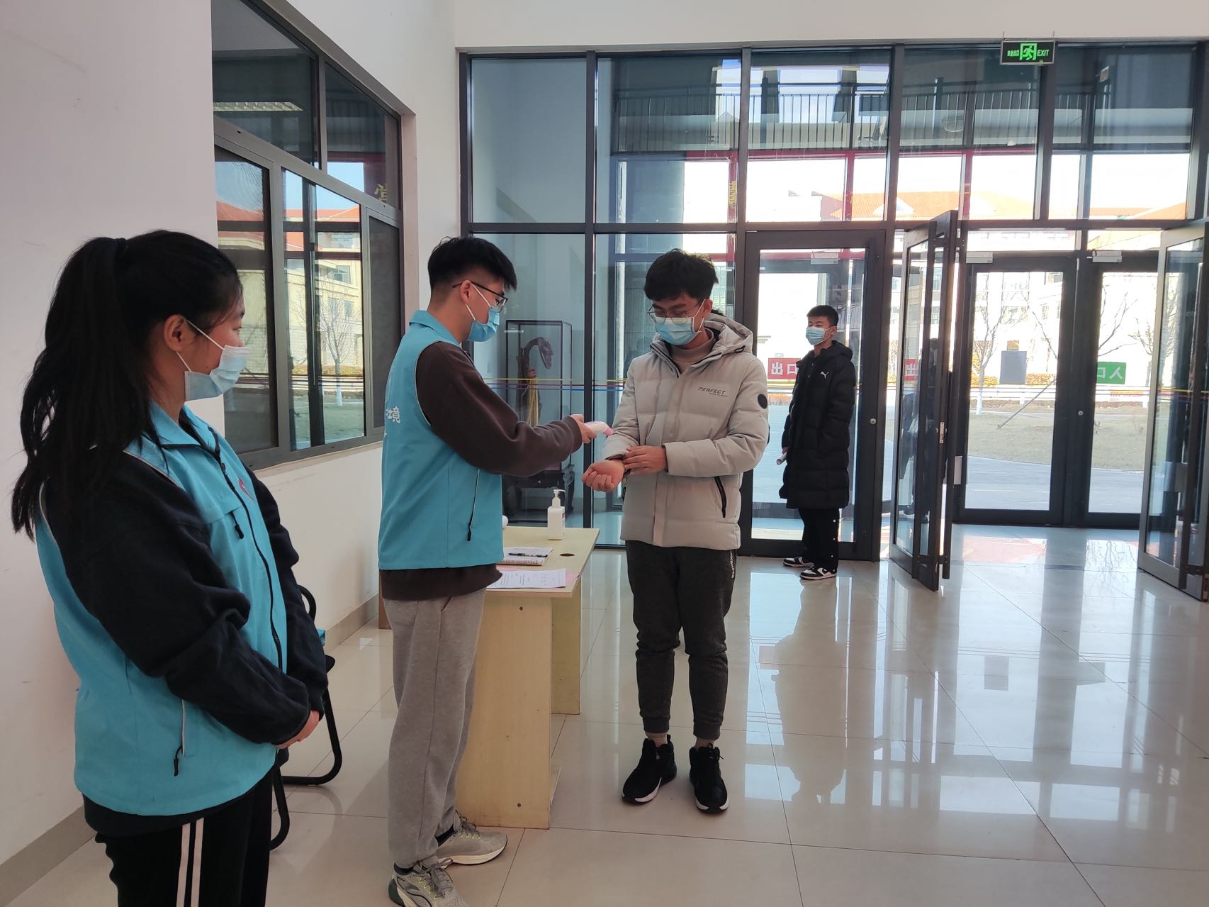 场景一模拟了学院所在楼宇人员来访时进行健康码核验、体温核验、手部消毒、信息记录等工作。来访人员间隔一米,有序排队进入检测区域,全部核查无误后方可进入学院。