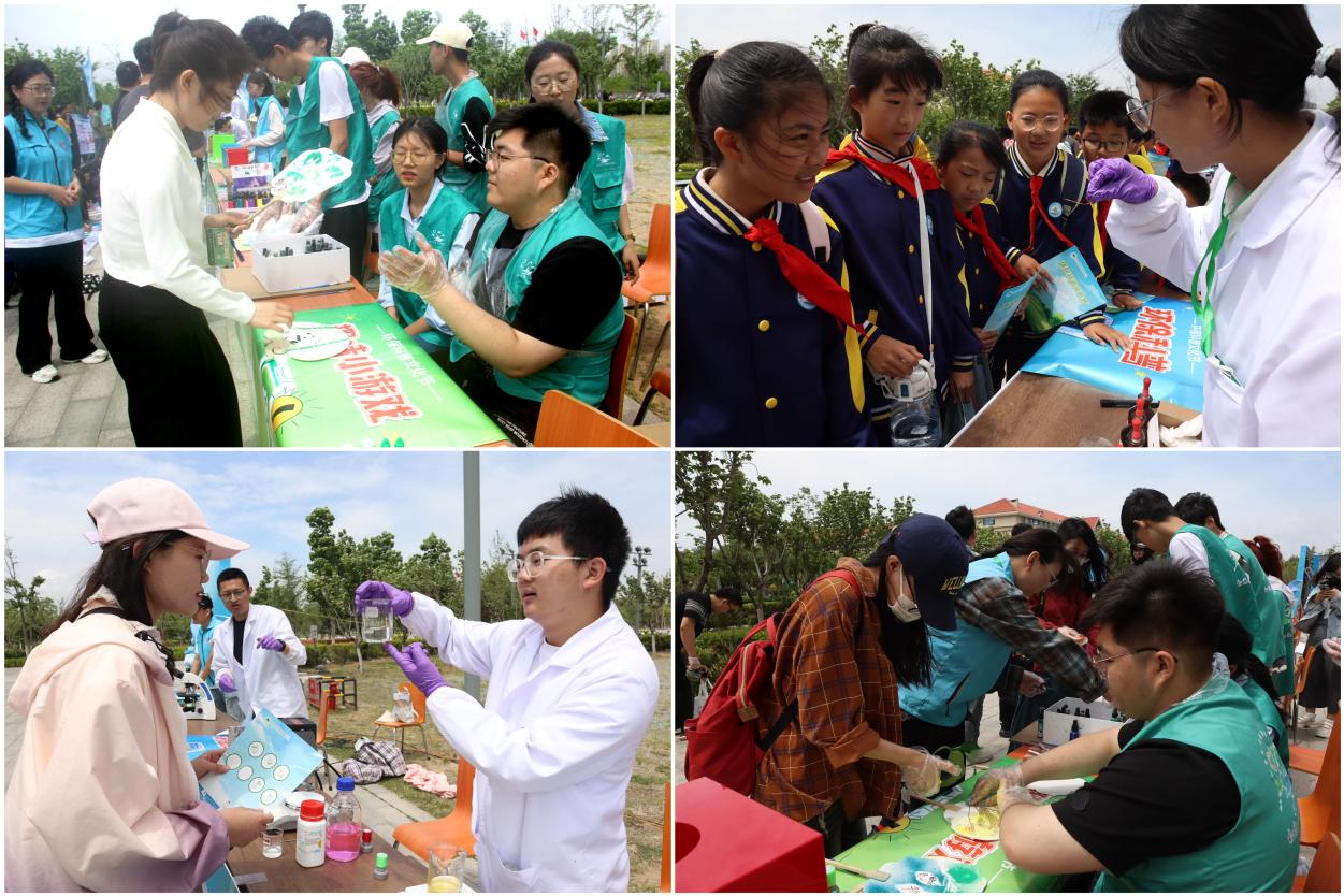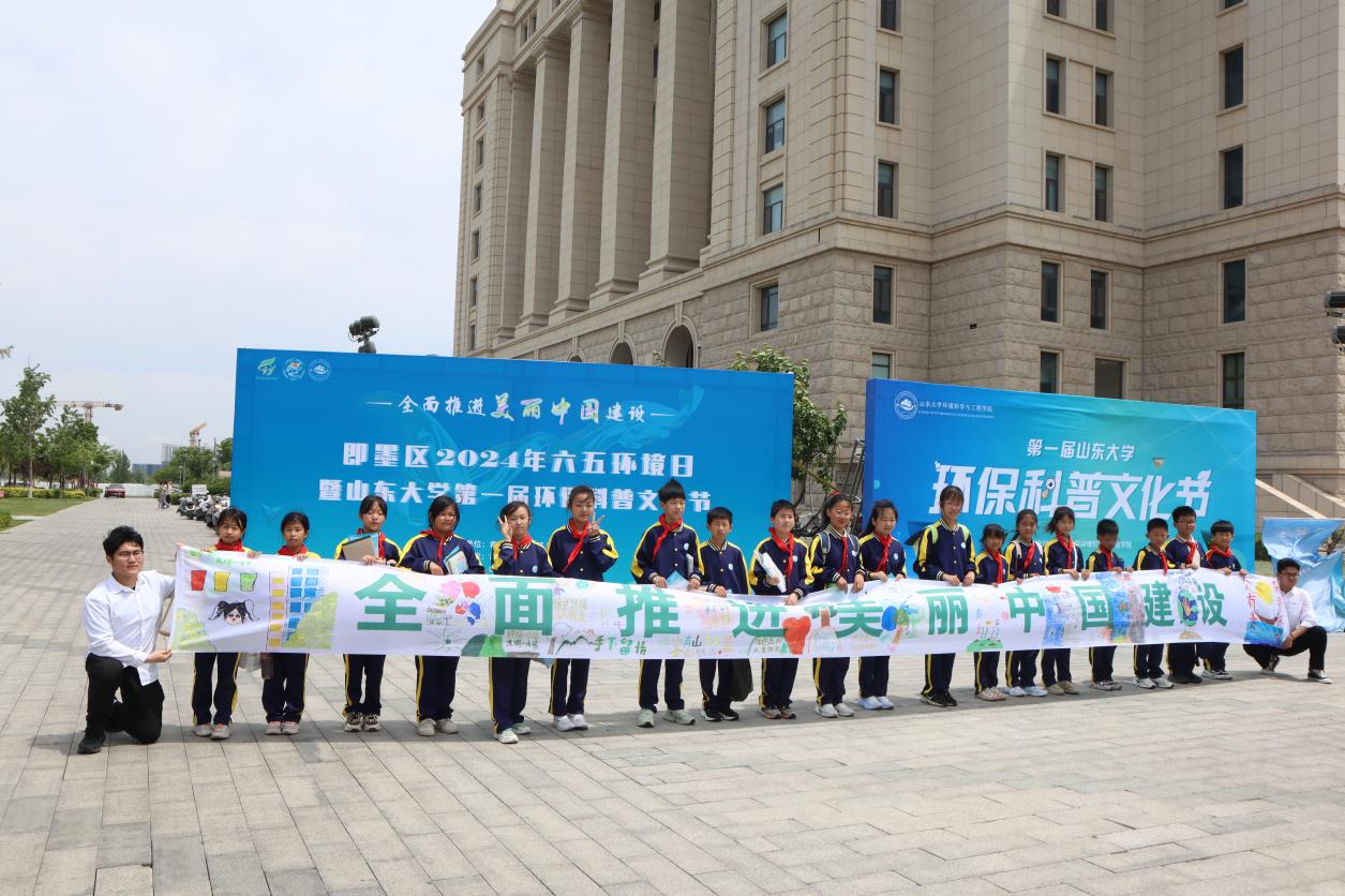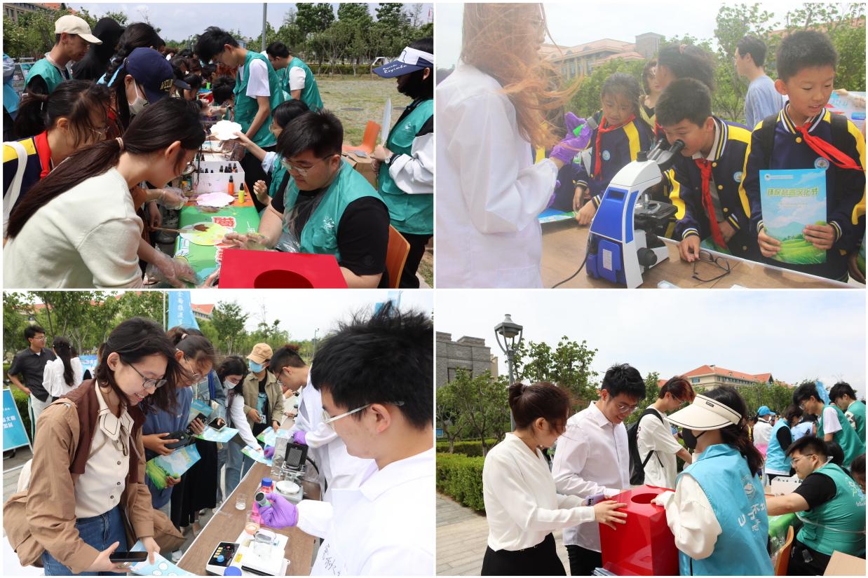 活动现场,青岛校区、即墨区德馨小学东校共百余名师生在现场参观实验仪器、参与趣味互动游戏。在环保科普实验“零距离”体验区,通过“小身体,大作用”“你相信‘光’吗?”等别开生面的科技“show”,给参加活动的学生们带来了一次沉浸式体验。在环保手作、环保知识问答、趣味小游戏等活动中,同学们用掉落的树叶等旧物改造成生态瓶、帆布袋、团扇等手工制品,践行旧物改造环保理念的同时,也激发了创造力。德馨小学全体师生发挥自身创意共同在十米画卷上勾勒美丽中国的时代图景。