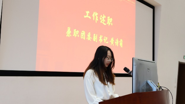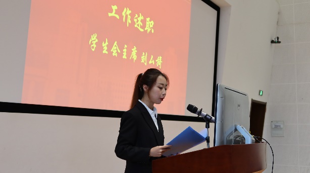 兼职团委副书记黄诗萌、第五届学生会主席刘厶旖、第二十二届研究生会执行主席徐天舒分别做述职报告。报告首先回顾了过去一年所做的工作及取得的成就,并对科创比赛、文体活动、志愿服务等几个重点工作进行了总结,并提请大会代表审议。